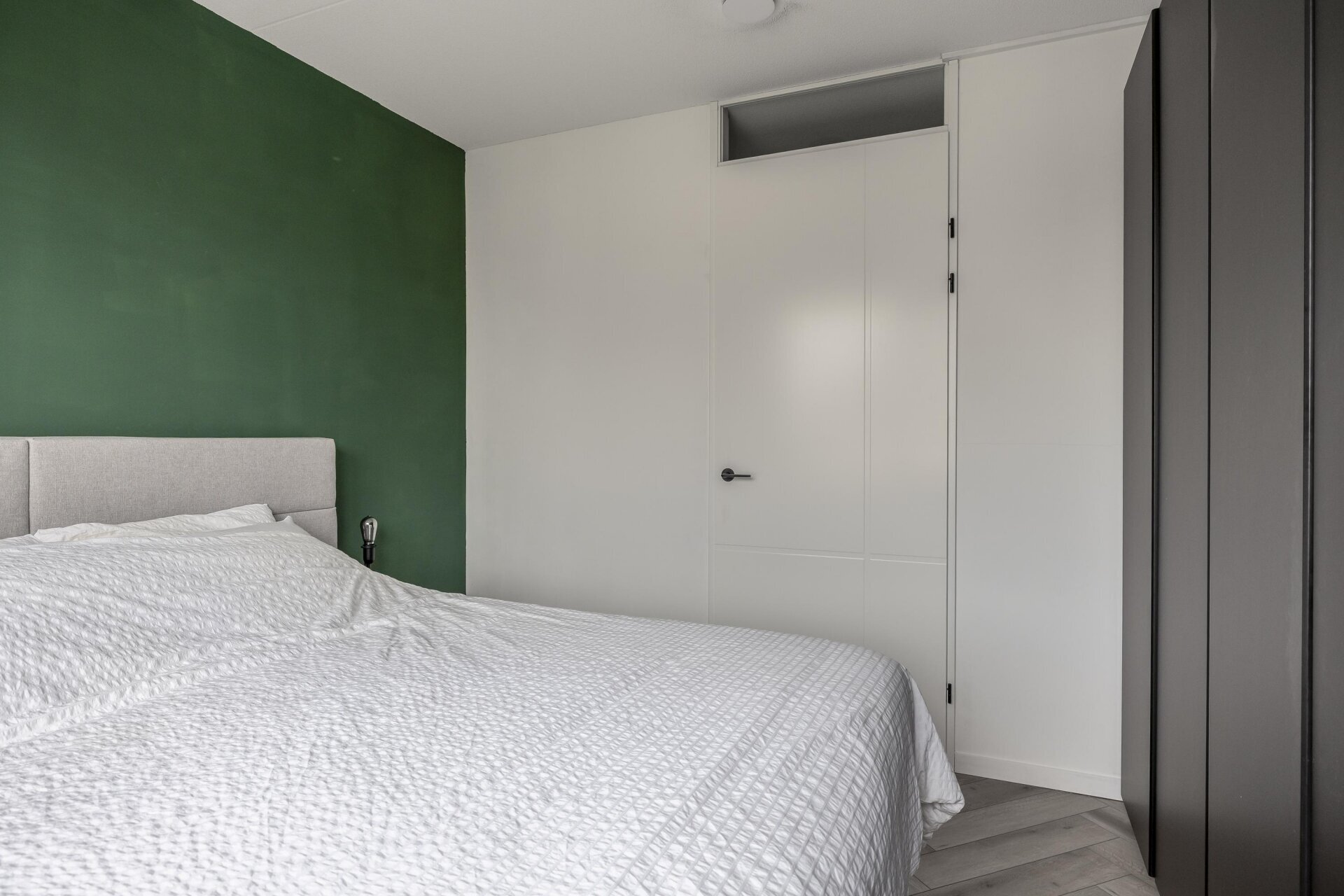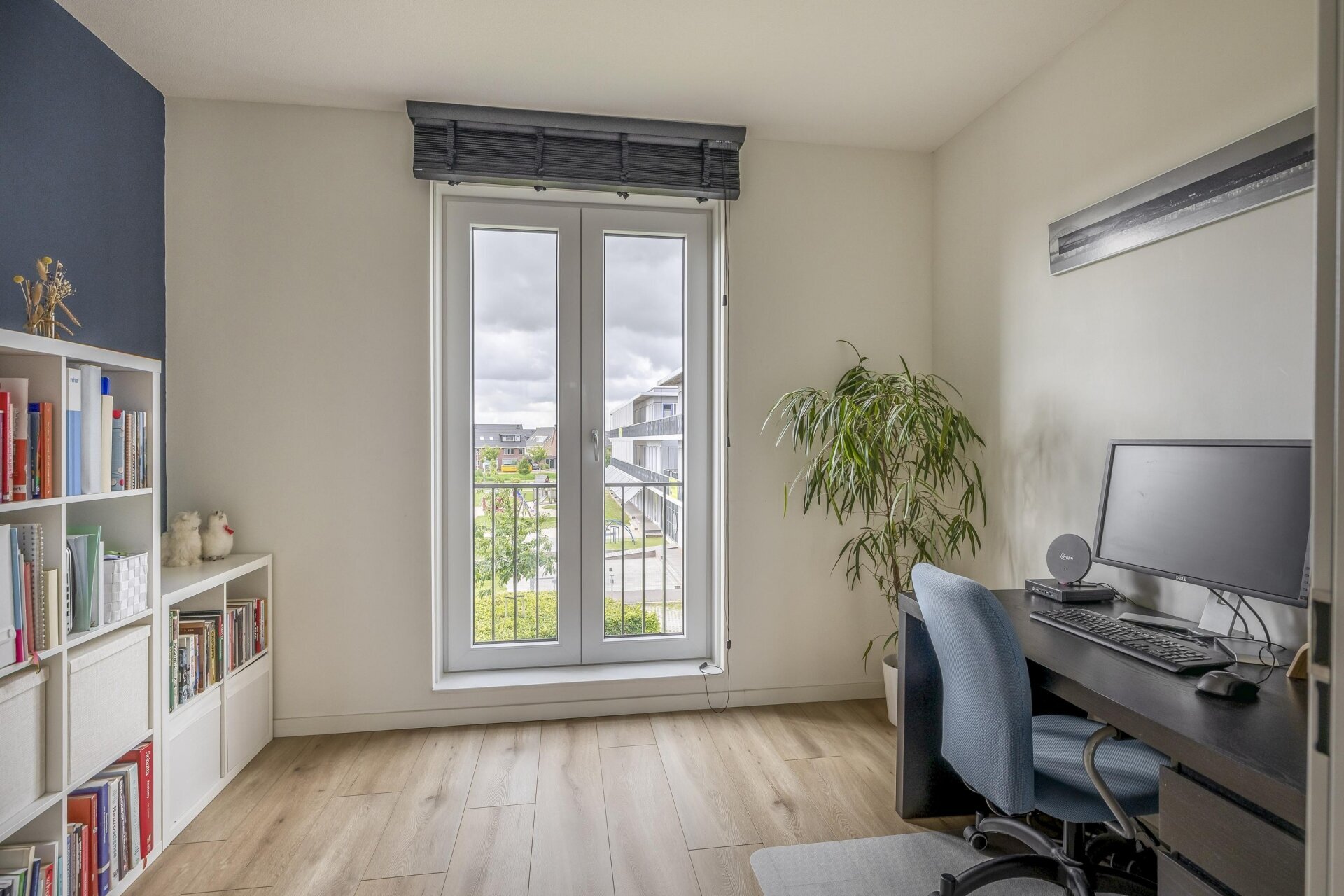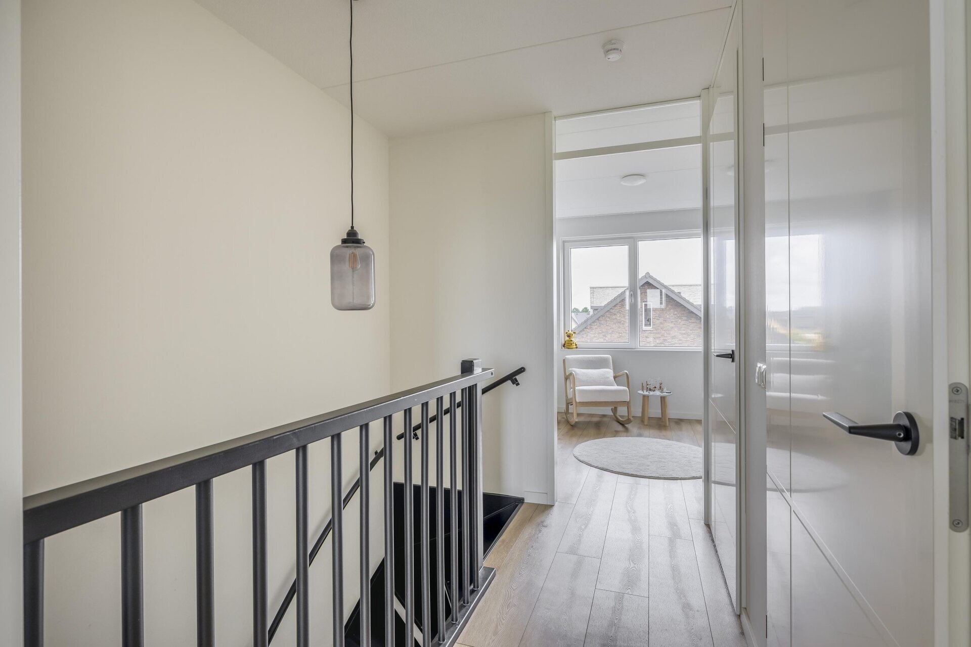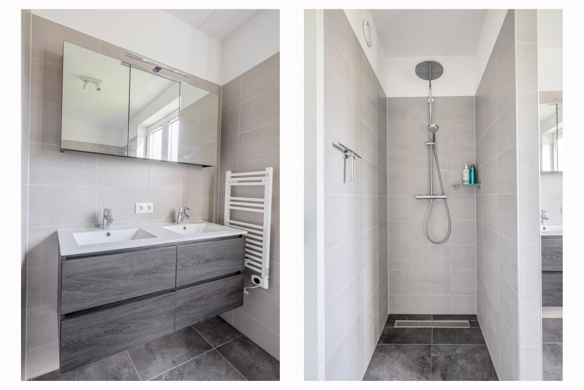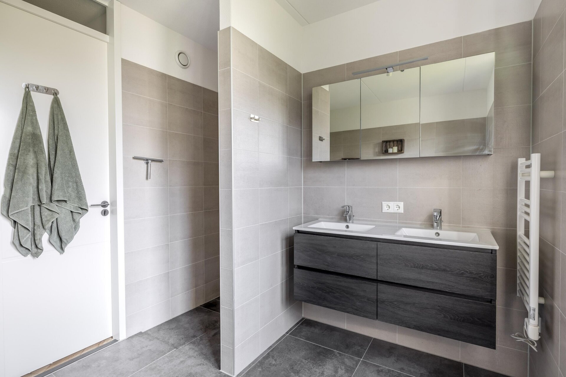 Overloop met toegang tot de eerste slaapkamer, gelegen aan de achterzijde. Royale, moderne badkamer voorzien van een ligbad, inloopdouche, dubbele wastafel met badkamermeubel. Separaat toilet met hangend closet en fonteintje.