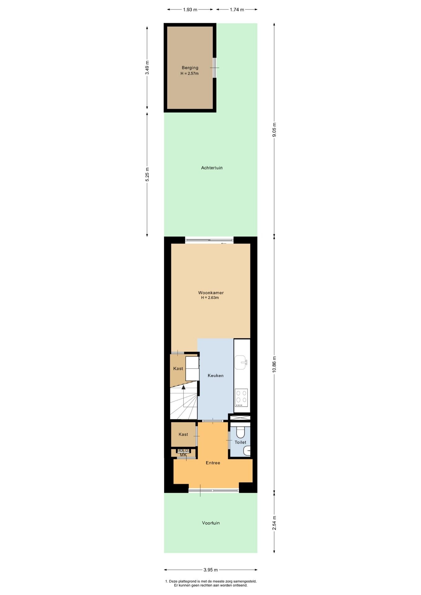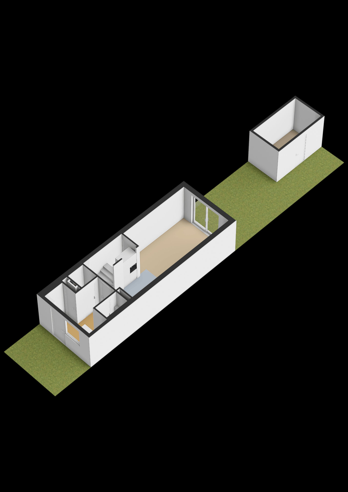 Entree woning met ruime hal; meterkast; bergkast met de opstelplaats van de warmtepomp en een toiletruimte met closet en fonteintje. Lichte woonkamer met een moderne open keuken in dubbele wandopstelling en voorzien van een koelkast, vriezer, vaatwasser, instant heetwater kraan, inductie kookplaat en afzuigkap. De woonkamer is voorzien van een schuifpui naar de achtertuin. In de achtertuin een berging. De beneden verdieping is voorzien van een PVC visgraatvloer.