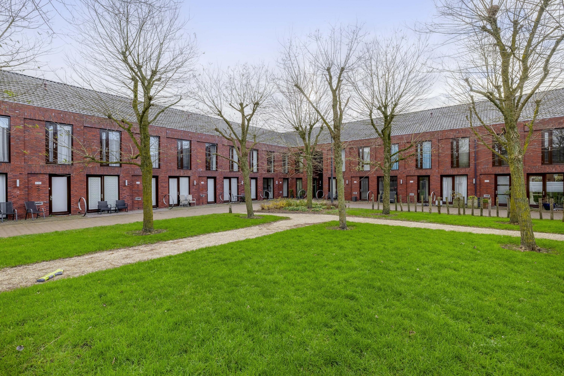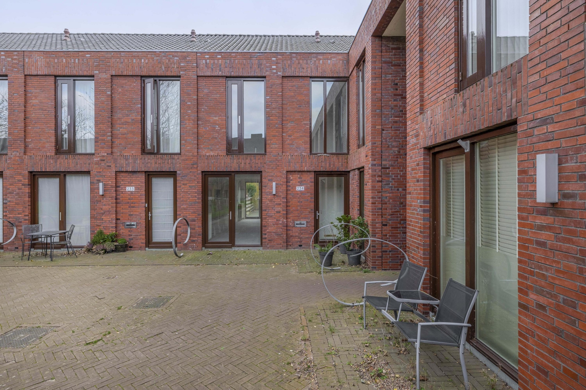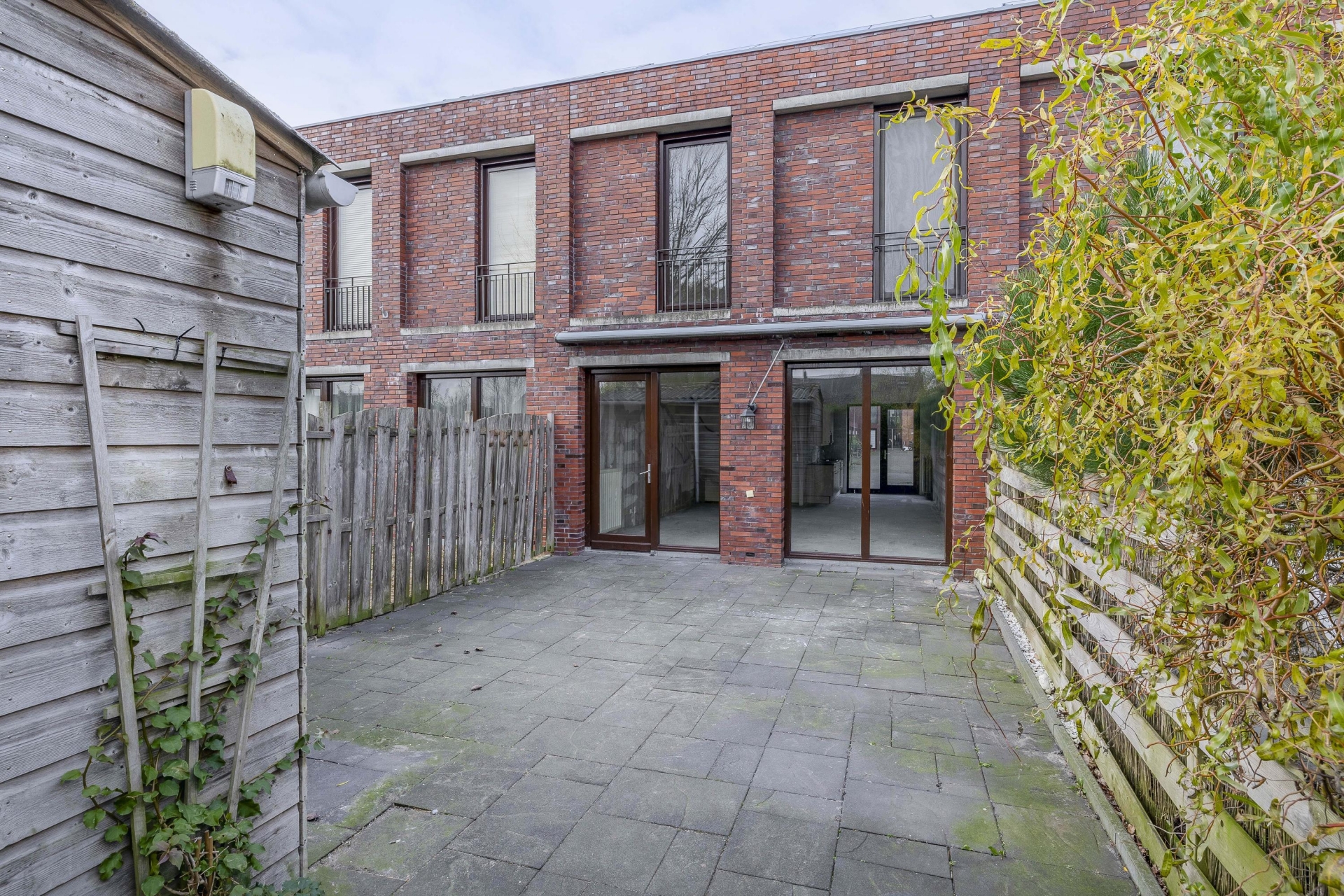 Entree via het gemeenschappelijke hof; ruime hal met garderobe, meterkast en toiletruimte met closet en fonteintje. Aan de voorzijde van de woning de halfopen keuken met keukenblok in wandopstelling. Lichte woonkamer met toegang tot de zonnige achtertuin. De achtertuin is voorzien van een zonnescherm, houten berging met elektra en achterom.