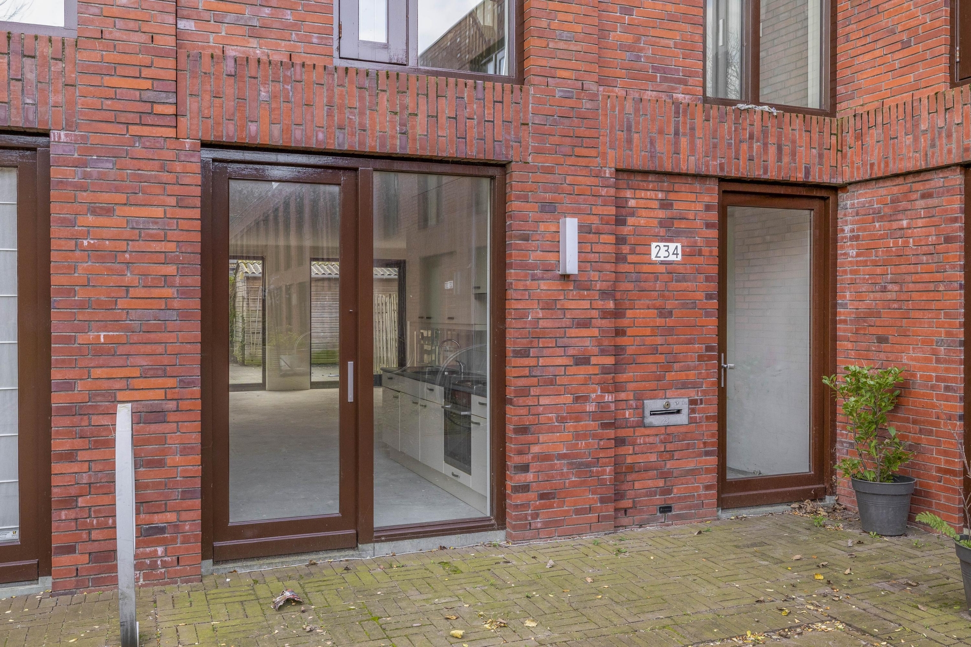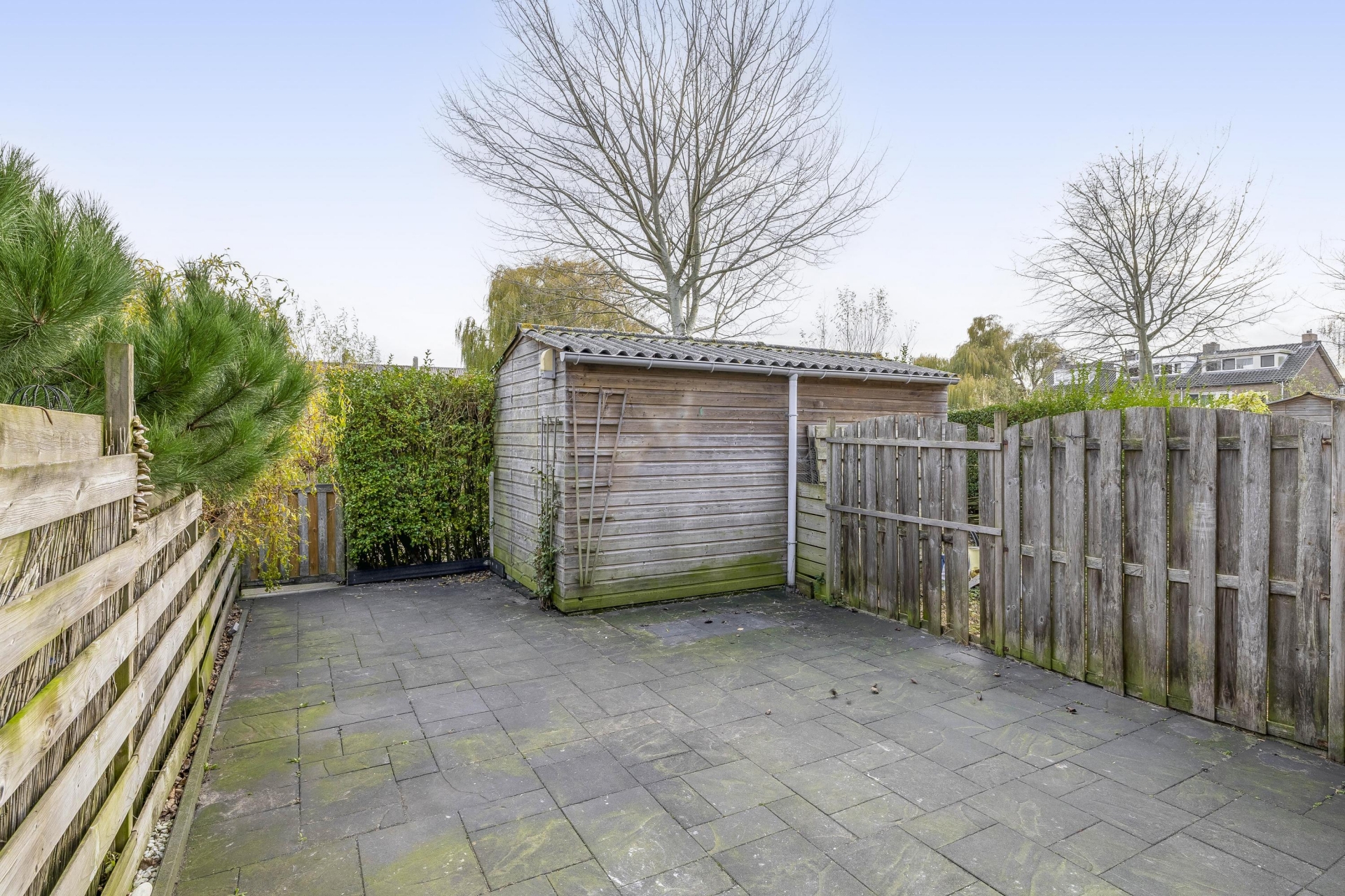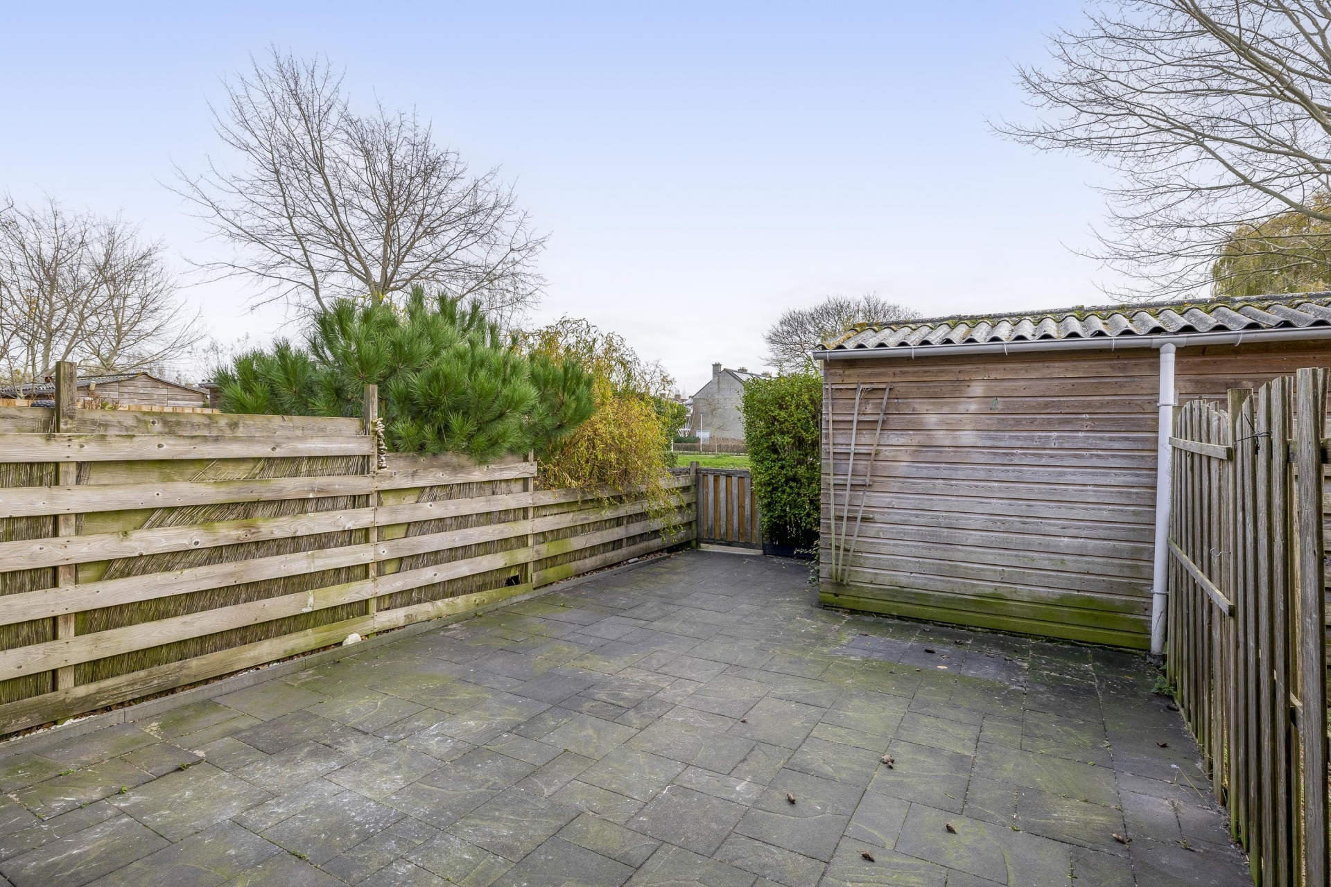 Entree via het gemeenschappelijke hof; ruime hal met garderobe, meterkast en toiletruimte met closet en fonteintje. Aan de voorzijde van de woning de halfopen keuken met keukenblok in wandopstelling. Lichte woonkamer met toegang tot de zonnige achtertuin. De achtertuin is voorzien van een zonnescherm, houten berging met elektra en achterom.