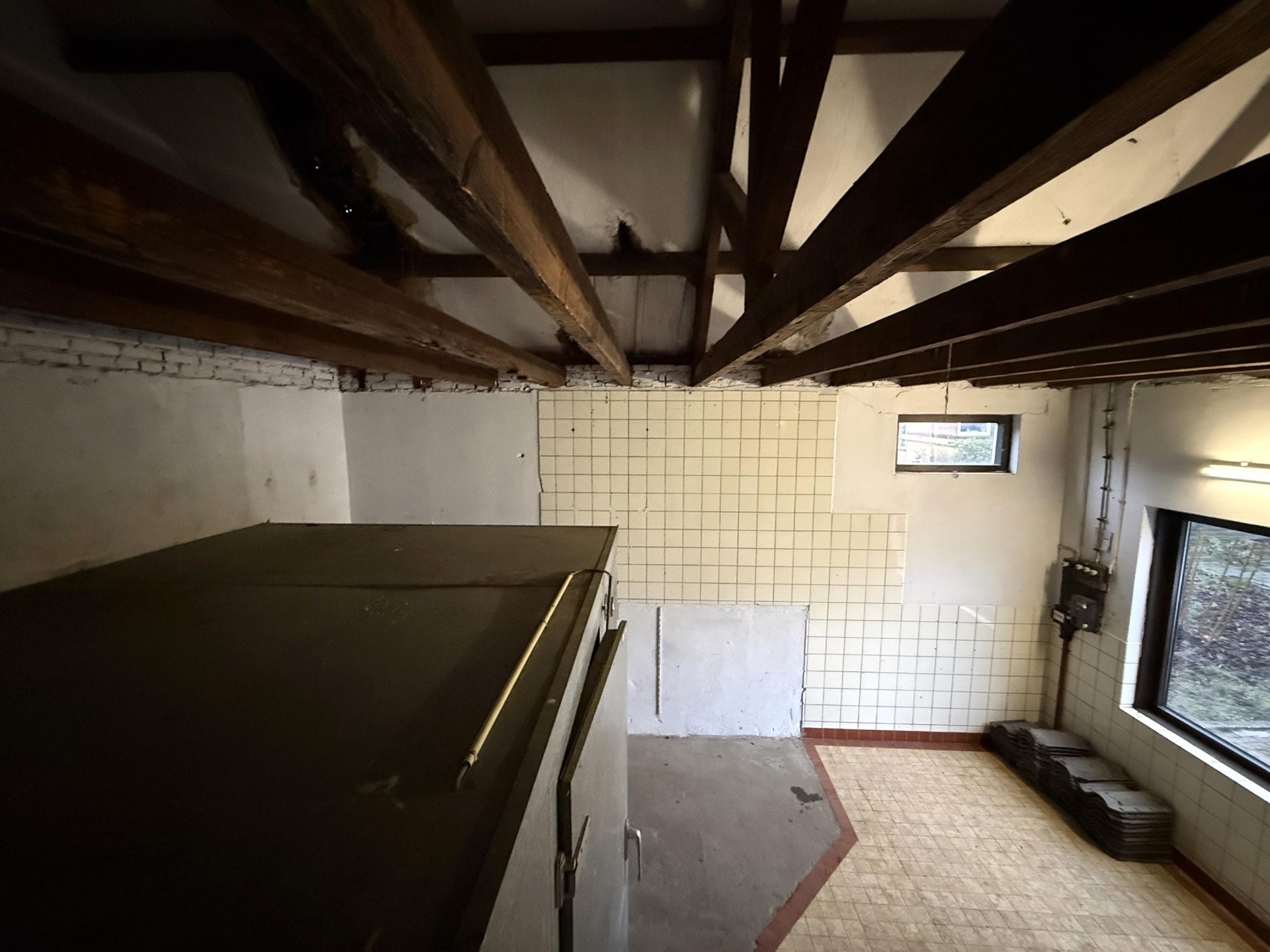 Het dak heeft in het verleden een lekkage gehad. De dakpannen zijn hersteld en het dak is op dit moment waterdicht, maar toekomstig onderhoud moet worden meegenomen in de plannen. Voor een handige koper of investeerder biedt dat ruimte om het gebouw verder te optimaliseren.